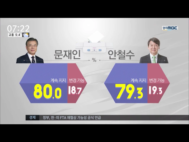 (앵커) 지지율에서는 문재인 후보가 안철수 후보를 큰 차이로 앞서가고 있지만 아직 변수는 남아 있습니다. 지지 후보를 바꿀 수 있다는 응답자가 20%를 넘었습니다. 이어서 양현승 기자가 보도합니다. (기자) (CG) 지금 지지하는 후보를 계속 지지할 지, 아니면 바꿀 수 있는 지 물었습니다. 76.2%는 계속 지지하겠다고 답...