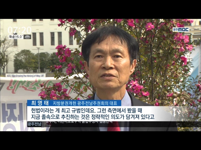 (앵커) 자유한국당과 국민의당,바른정당이 5월 9일 대선 때 개헌 국민투표를 하자고 합의한 데 대해 광주에서도 반발이 나오고 있습니다. 비판의 화살이 국민의당에 쏠렸습니다. 윤근수 기자 (기자) 지방 분권형 개헌을 요구하며 두달 전 출범한 시민사회단체가 긴급 기자회견을 열어 개헌안 발의를 중단하라고 요구했습니...