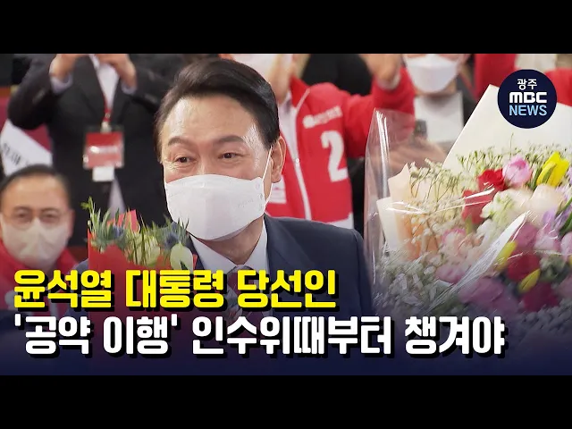 (앵커) 윤석열 대통령 당선인이 차기 정부 5년을 이끌어갈 수장으로 뽑혔습니다. 선거운동기간 내내 광주,전남 핵심 공약에 대한 집중 지원을 약속한 만큼, 인수위원회부터 차기 정부의 중점 과제로 추진할 수 있도록 실천 의지를 보여주야 합니다. 한신구 기자의 보도입니다. (기자)윤석열 차기 대통령 당선인은 출마 선언...