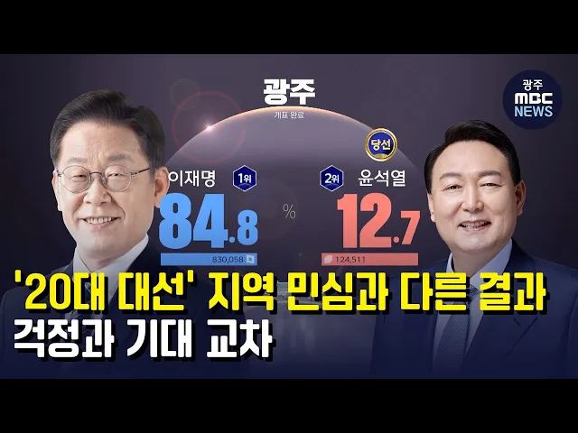 (앵커) 이번 대선 결과를 두고 광주전남지역의 여론도 엇갈리고 있습니다. 호남의 압도적인 지지를 받고도 낙선한 후보에 대한 실망, 국민적 지지를 얻어 당선된 후보에 대한 기대감, 여기에다 앞으로가 더 중요하다는 반응도 나왔습니다. 이다현 기자입니다. (기자)더불어민주당 관계자들이 광주 시민들에게 고개를 숙였습...