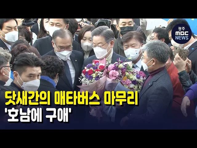 (앵커)매타버스를 타고 호남을 찾은 이재명 후보가닷새간의 일정을 모두 마무리했습니다.미지근한 호남 민심에 구애하는 일정이 대부분이었는데,특히 마지막 일정으로 이낙연 전 대표의 고향인영광을 찾아 지지를 호소했습니다.송정근 기자입니다.(기자)이낙연 전 대표의 고향인 영광을 찾은이재명 더불어민주당 대통령 후...
