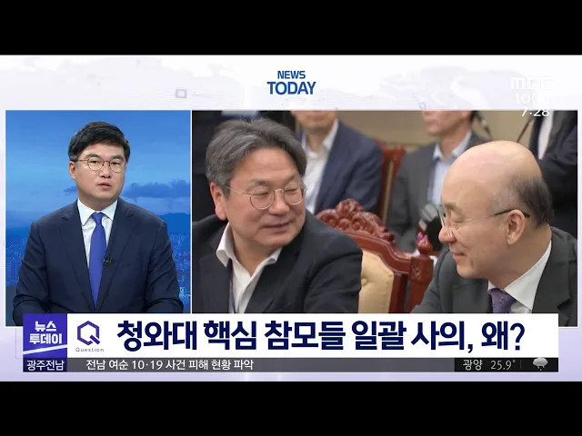 (앵커) 노영민 대통령 비서실장과 비서실 소속 수석 비서관 5명이 지난주, 일괄 사의를 표명했습니다. '최근 상황에 대한 종합적인 책임을 지겠다'는게 이유인데, 좀 더 자세한 내용 살펴보겠습니다. 정준호 변호사 나와있습니다. 안녕하십니까? (앵커, 출연진 함께 인사) =========================================== 질...