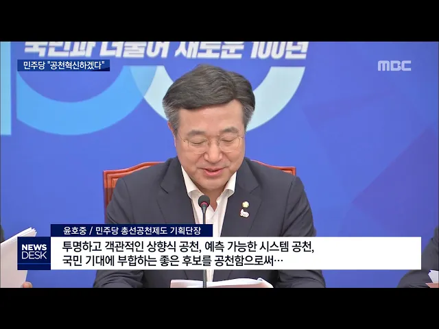 (앵커) 자유한국당의 장외 투쟁을 총선 전략으로 보는 시각들이 있는데요. 민주당은 여야 정당들 가운데 가장 먼저 공천 룰을 확정하면서 총선 채비에 들어갔습니다. 보도에 정용욱 기자입니다. (기자) '기득권은 내려놓고 정치 신인들에겐 문턱을 낮춰 공천혁신을 유도하겠다' 민주당이 발표한 내년 총선 룰의 핵심 내용입...