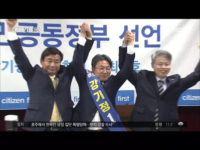 (앵커) 현직 시장이 불출마를 선언하고, 반 이용섭 연대에 나섰던 후보 3명은 단일화에 성공했습니다. 민주당 광주시장 경선이 결선투표까지 갈 가능성이 높은 가운데 후보간 경쟁은 더욱 치열해질 전망입니다. 이계상 기자.. (기자) 시민공동정부 구성을 내세우며 후보 단일화에 합의했던 강기정 민형배 최영호 후보, 여론...