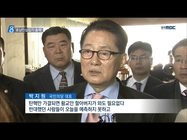 (앵커) 지지율 하락으로 고민이 많은 국민의 당이 텃밭인 광주에서 총력전을 펼쳤습니다. 지도부가 총출동해 광주의 민심을 잡는데 올인했습니다. 호남의 권리를 지키는 정권교체를 이루겠다고 하면서 한편으로는 민주당의 대선 후보를 강도높게 비판했습니다. 김철원 기자입니다. (기자) 국민의당 박지원 대표와 주승용 원...
