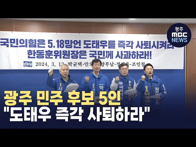 더불어민주당 광주 총선 후보들이 "국민의힘은 5.18 망언 도태우 후보를 즉각 사퇴시키고대국민 사과하라"고 촉구했습니다. 동남갑 정진욱, 동남을 안도걸, 서갑 조인철, 서을 양부남, 광산갑 박균택 등 5인은 오늘(13) 공동 기자회견을 열고 국민의힘이 5.18 왜곡·폄훼 발언으로 물의를 일으키고 있는 도태우 변호사의 대...