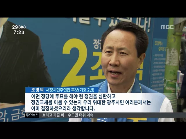(앵커) 광주 서구 을 국회의원 보궐선거 마지막 선거운동일인 어제 후보들은 사력을 다해 한 표를 호소했습니다. 김철원 기자입니다. (기자) 선거운동 마지막 날, 후보들은 한표라도 더 얻기 위해 비를 맞아가며 안간힘을 쏟았습니다. 새누리당 정 승 후보는 집권여당의 힘 있는 국회의원이 뽑히면 광주의 경제지도가 바뀔 ...
