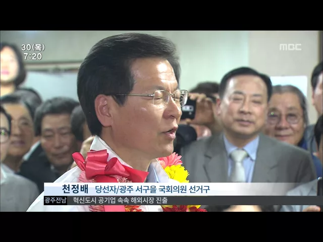 앵커:저희 스튜디오에 광주 서구을 국회의원 선거구의 승자인 천정배 당선자가 나오셨습니다. 축하드립니다. 유권자께 한 말씀 부탁드립니다. 천정배 의원: 위대하신 광주 서구 을 유권자들의 승리입니다. 저는 그저 여러분의 뜻을 따르고 대변했다고 생각합니다. 감사합니다. 앞으로 여러분의 뜻을 하늘처럼 받드는 정치를...