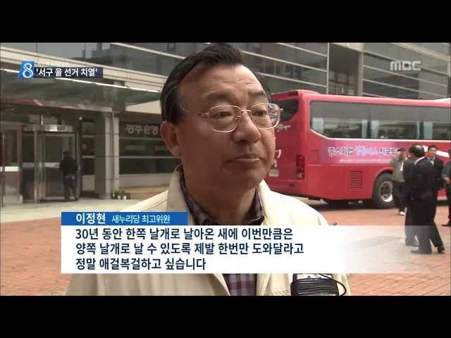 (앵커) 4.29 재보궐선거가 이제 한달도 남지 않았습니다. 광주 서구 을 선거구는 거대 정당과 거물 정치인의 대결로 열기가 뜨거워지는 분위기입니다. 새누리당과 새정치연합은 당 지도부가 직접 나서 연일 후보를 지원하고 있습니다. 보도에 김철원 기자입니다. (기자) 새누리당이 정 승 후보 지원에 총력을 기울이고 있습...