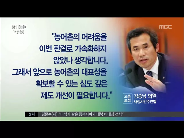 현행 선거구제도에 대한 헌재의 헌법 불합치 판결과 관련해 새정치민주연합 강기정 의원은 이번 판결을 계기로 독일식 정당명부 비례대표제 도입을 비롯한 근본적인 변화를 모색하는 정치 개혁이 이뤄져야 한다고 밝혔습니다. 또 이번 판결로 농어촌의 경우 지역간 균형이 무너지는 현상이 가속화되고, 지역 대표성의 약화...