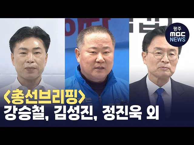 총선브리핑 시간입니다.강승철 광주 서구갑 진보당 예비후보는 "서구를 마이스관광·미래차 특화단지로 육성하고, 광주형 공공은행·서민부채탕감기금 등을 조성해 서구의 일자리와 삶의 질을 높이겠다"고 약속했습니다. 김성진 광주 광산을 민주당 예비후보는 "광산 일대 재개발과 재건축을 활성화시키고 고등학교 신설, 청...