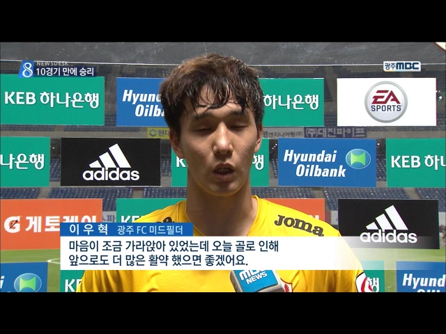 프로축구 광주 FC가 10경기만에 승리하며 시즌 3승를 기록 반등의 기회를 마련했습니다. 광주 FC는 어제(9일) 광주월드컵경기장에서 열린 K리그 19라운드 FC서울과의 경기에서 전반 37분 송승민,후반 12분 김영빈, 후반 32분 이우혁 선수가 골을 성공시키며 3대2로 승리했습니다. 시즌 3승을 기록한 광주 FC는 오는 12일 홈...