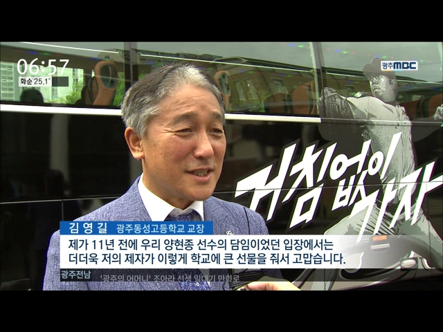(앵커) 기아 타이거즈의 토종 에이스 양현종 선수가 모교 야구단에 대형버스를 기증했습니다. 고교를 졸업하면서 세운 약속을 지킨 겁니다 송정근 기자입니다. (기자) 광주 동성고에 검은색 대형버스가 등장했습니다 양현종 선수의 역동적인 투구 동작과 '거침없이 가자'라는 문구가 적힌 버스. 지난 5일 양현종 선수가 모...