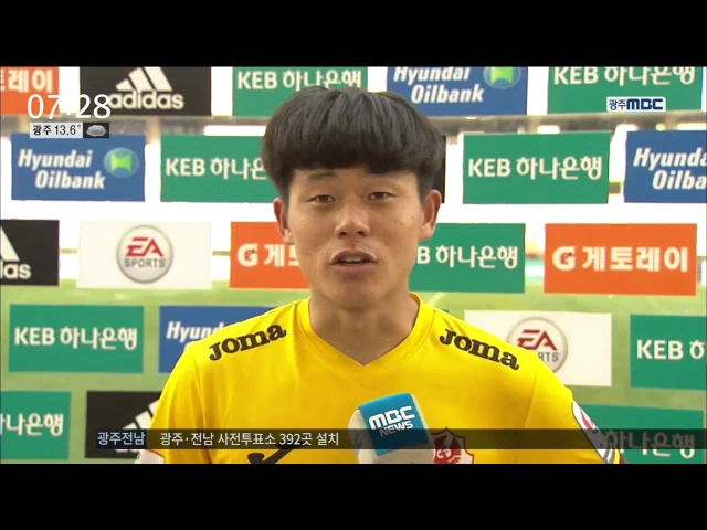 ◀ANC▶ 프로축구 광주FC가 선두 전북현대를 상대로 기분좋은 승리를 기록했습니다. 광주 FC 창단 이후 한번도 이기지 못했던 전북 현대를 잡아 반등의 기회를 얻게됐습니다. 박재욱 기자입니다. ◀END▶ ◀VCR▶ 치열한 공방전이 펼쳐지던 전반 추가 시간. 문전 앞 혼전 상황에서 흘러나온 볼을 여봉훈이 멋진 발리 킥...