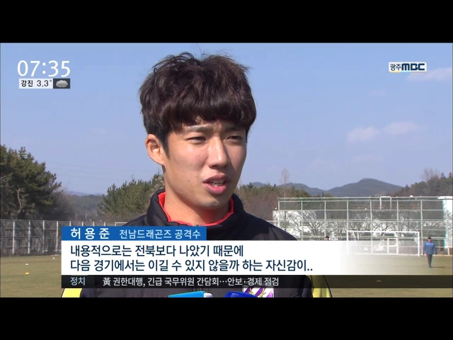 ◀ANC▶ 프로축구 전남드래곤즈가 이번 주말, 첫 홈 경기를 앞두고 훈련에 열을 올리고 있습니다. 개막전에서는 아쉽게 졌지만, 한층 성숙한 경기력을 보여주면서 올 시즌 기대감을 높이고 있습니다. 문형철 기자의 보도입니다. ◀VCR▶ 한겨울 추위가 물러간 푸른 잔디 위에서 드래곤즈 선수들이 훈련에 몰두합니다. 날...