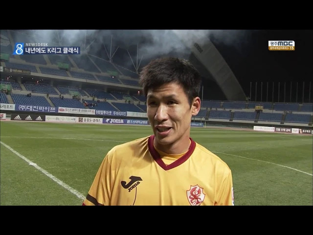 (앵커) 광주 FC가 정조국의 극적인 동점골로 K-리그 클래식 잔류를 확정지었습니다. 이번 시즌 광주로 이적해 맹활약한 정조국은 시즌 득점왕 등극이 유력해졌습니다. 한신구 기자의 보도 (기자) ◀SYN▶ 정조국 동점골 패색이 짙던 후반 추가 시간.. 광주 FC 정조국이 그림같은 헤딩슛으로 동점을 만듭니다. 이 골로 광주...