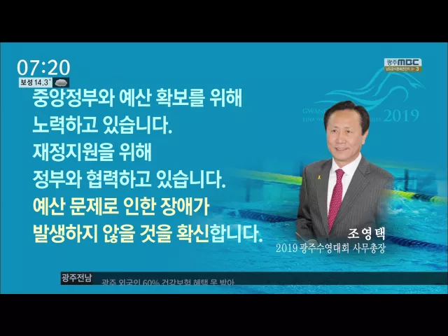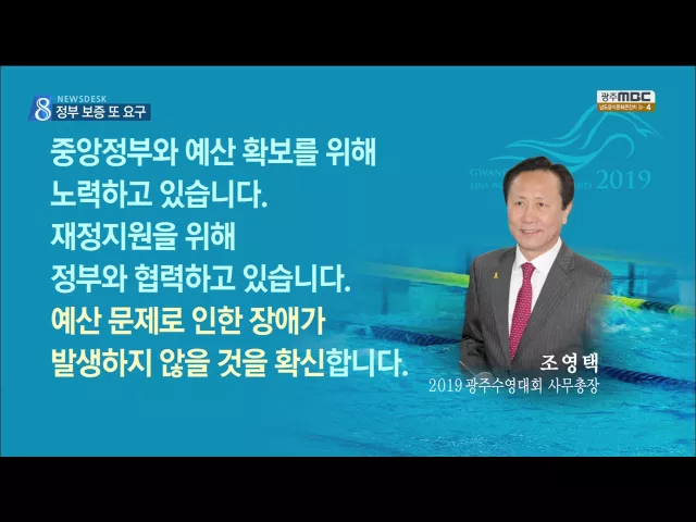 (앵커) 2019 광주 수영선수권대회와 관련해 국제수영연맹이 정부 예산 보증을 요구하는 서한을 최근 또 보낸 사실이 확인됐습니다. 광주시와 조직위원회는 대수롭지 않다는 분위기인데 이래도 되는 지 모르겠습니다. 김철원 기자가 취재했습니다. (기자) 국제수영연맹 FINA가 지난달 광주수영선수권대회의 예산에 대한 정부...