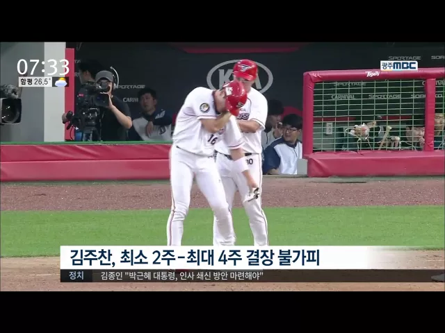 (앵커) 기아 타이거즈, 타선의 중심인 김주찬 선수가 부상으로 최대 한달 정도 결장이 불가피합니다. 복귀 때까지 최대한 버티는 게 가을 야구의 관건이 되고 있습니다. 프로축구 광주 FC 정조국 선수는 시즌 14골로 '득점 선두'로 나섰습니다. 한신구 기자의 보도 (기자) 지난 22일, 상대 투수가 던진 공에 왼쪽 어깨를 얻...