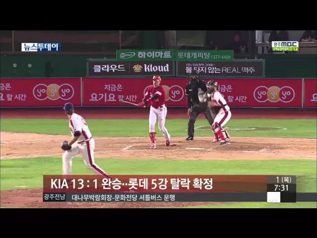 ◀앵 커▶ 스포츠투데입니다. KIA와 롯데의 치열했던 5강 싸움은 KIA의 승리로 끝을 맺었습니다. 올 시즌 마지막 2연전에서 KIA가 완승을 거두며 롯데는 포스트시즌 진출 실패를 확정지었고 KIA는 실낱같은 5강 희망을 이어가고 있습니다. ◀VCR▶ 1승이 절실한 KIA타이거즈. 시즌 내내 답답했던 공격력이지만 중요한 순간 ...
