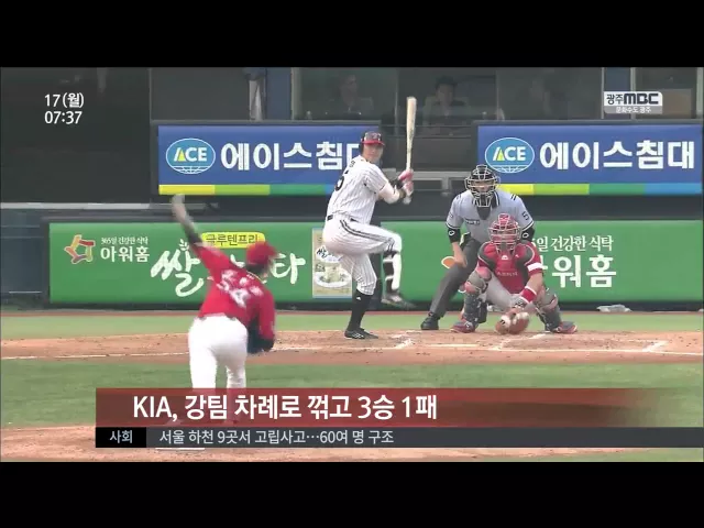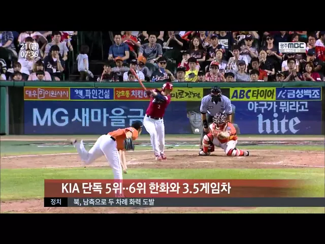 ◀앵 커▶ 스포츠투데입니다. KIA 타이거즈, 참 감질맛나는 순위 경쟁을 이어가고 있습니다. 단독 5위 입성의 기쁨을 맛보고 있었는데요. 하루만에 다시 5위 자리를 내줬습니다. 올 시즌 치른 첫 월요일 경기에서 엘지에 한 점차로 승리를 내주며 아쉽게 고개를 떨궜습니다. ◀VCR▶ 두 점 뒤지던 9회. 김민우가 솔로포를 쏘...