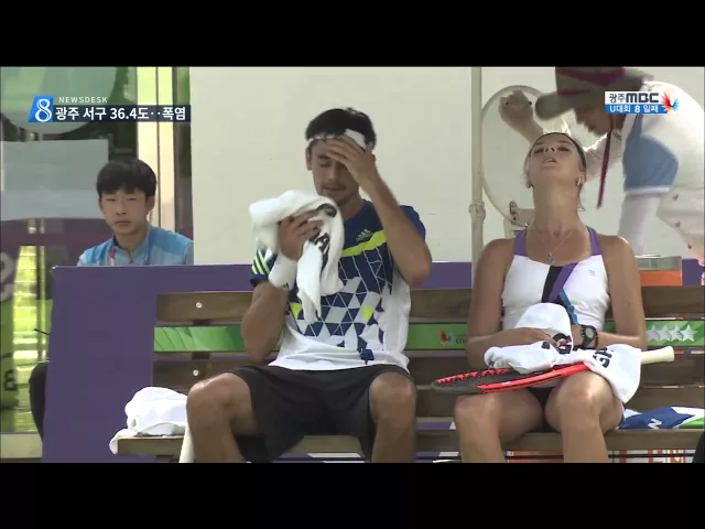 (앵커) 오늘 많이 더우셨죠? U대회 주경기장 주변은 낮 최고기온이 사람의 체온 만큼 올랐다는데... 선수나 관중이나 얼마나 더웠을까요? 김인정 기자가 보여드립니다. (기자) (슬로우 모션) 강렬한 스매싱을 날리는 선수에게서 분수처럼 땀이 솟구칩니다. 숨이 턱턱 막히는 더위에 선수들은 찜통 속에 들어간 기분. 살갗 ...