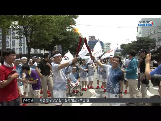 (앵커) 광주 유니버시아드 대회가 드디어 오늘 개막합니다. U대회 성화가 광주에 입성했고, FISU 회장은 대회 준비가 만족스럽다고 평가했습니다. 김철원 기자입니다. (기자) 프랑스 소르본 대학에서 시작한 성화봉송이 전 세계 3천 7백킬로미터를 돌아 광주에 들어왔습니다. 광주시민을 대표해 성화 봉송 주자로 나선 양궁...