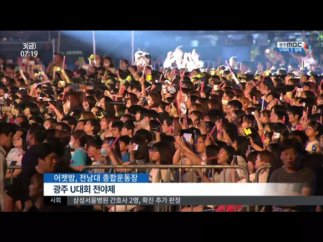◀ANC▶ 광주유니버시아드 대회 개막을 하루 앞둔 어젯밤, 광주는 젊음의 뜨거운 열기로 가득찼습니다. 전야제 표정을 양현승 기자가 전해드립니다. /// ◀VCR▶ 12일 동안 지구촌 젊음의 열전을 기원하는 전통 공연. 부드러우면서도 엄숙한 춤사위에 해외 인사들은 박수와 환호로 화답했습니다. 열정의 도시 광주에서 열...