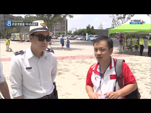 (앵커) 광주에 관광 경찰이 떴습니다. U대회를 지원하기 위해 파견한 건데요. 하는 일도 일반 경찰과는 다르고 차림새도 눈길을 끕니다. 송정근 기자가 취재했습니다. (기자) 중절모에 선글라스를 낀 남성이 선수촌을 돌아다니며 외국 선수들과 이야기를 나눕니다. 외국인들이 한국에서 겪게 되는 불편 사항 등을 해결해 주...