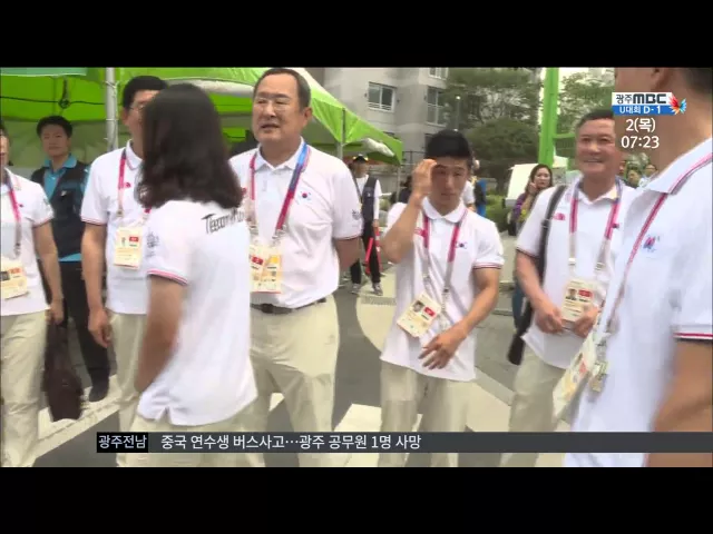(앵커) 광주 하계 유니버시아드가 이틀 앞으로 다가왔습니다. 전국을 누빈 성화도 광주에 도착했습니다. 우리나라 대표팀이 광주에 입성한 가운데 세계인들이 모여드는 선수촌은 축제 분위기가 달아오르고 있습니다. 첫 소식, 김철원 기자입니다. (기자) 한국선수단이 U대회 결전지 광주에 도착해 화정동 선수촌에 입성했습...