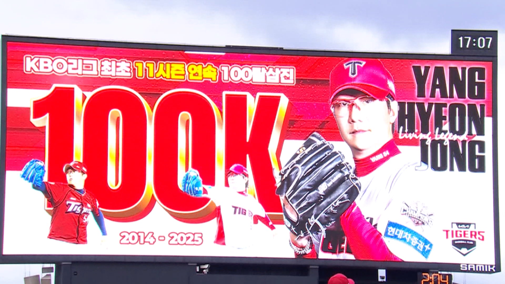 KIA타이거즈의 양현종 선수가 KBO 리그 최초로 11시즌 연속 100 탈삼진이라는 대기록을 작성했습니다.양현종 선수는 어제(20일) 광주기아챔피언스필드에서 열린 NC와의 홈 경기에 선발로 등판해 1회초에 이우성을 삼진으로 잡아내며 11시즌 연속 100 탈삼진 기록을 달성했습니다.양현종 선수는 지난해 8월 KBO 리그 역대 최...