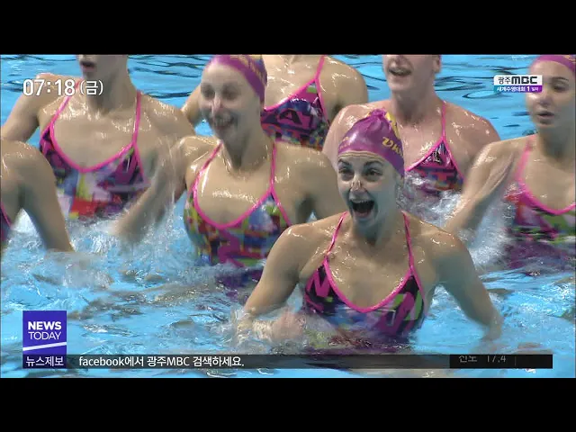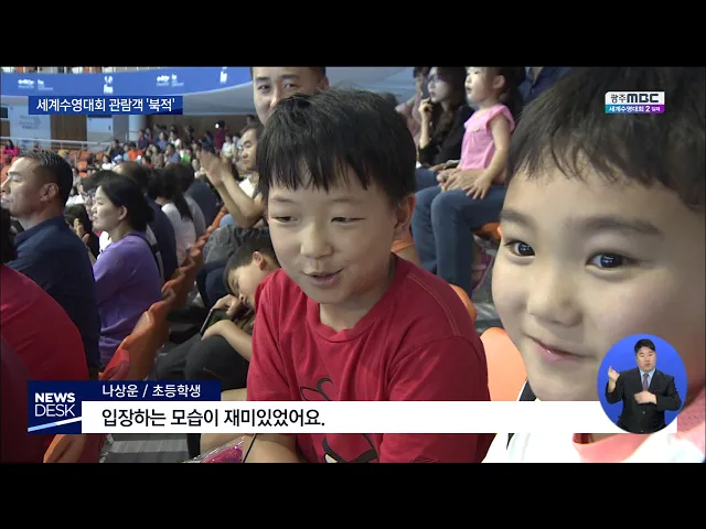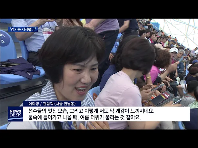 (앵커) 광주 세계수영선수권대회가 막을 올린 지 이틀째이자 첫 주말을 맞았습니다. 세계적인 수영 선수들의 화려한 기술과 예술 연기를 직접 보기 위해 전국 각지에서 온 관람객들이 경기장을 찾았습니다. 이계상 기자.. (기자) 남녀 한 쌍의 선수들이 물살을 가르며 환상의 연기를 선보입니다. 어느새 물속으로 사라졌다...
