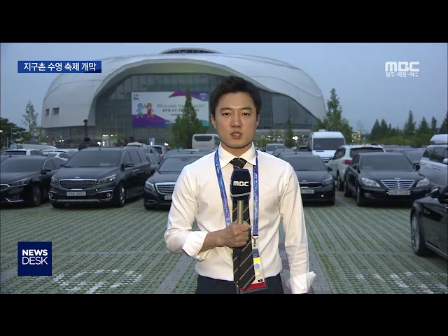 (앵커) (남)이번엔 주경기장으로 가보죠. (여)주경기장은 남부대학교 국제수영장인데요. 여기에서는 다이빙과 경영 종목 경기가 열립니다. (남)우종훈 기자? 경기는 이미 시작됐죠? (기자) 네, 남부대학교 국제수영장에 나와 있습니다. 이 곳은 이번 대회 6개 종목 가운데 가장 많은 메달이 걸려있는 경영과 다이빙 경기가 ...