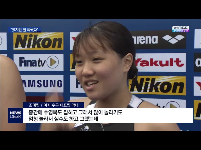 (앵커) 우리나라 첫 여자 수구 대표팀이 광주 세계수영선수권 대회에서 강호 헝가리를 상대로 국제무대 첫 경기를 치렀습니다. 세계의 벽은 높았지만 의미 있는 첫 행보였습니다. 송정근 기자입니다. (기자) 막고, 또 막아보지만.. (효과) 유럽의 강호 헝가리 선수들의 슈팅은 계속됩니다. 여자 대표팀의 경기 결과는 0대 6...
