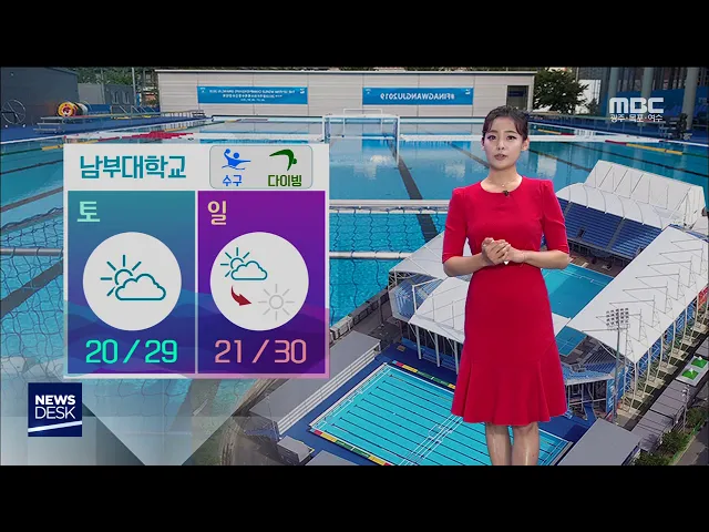 ◀ANC▶ 수영대회가 한여름에 열리다보니 날씨가 경기와 관람에 영향을 미칠 수도 있겠는데요, 대회 기간 날씨를 기상센터를 통해 알아보겠습니다. 이다솔 기상캐스터 전해주시죠. ◀VCR▶ 네, 대회 초반에는 구름이 많이 끼면서 폭염 수준의 더위는 없겠지만 습도가 높아서 후텁지근한 날이 많겠습니다. 다음주 중반에는...