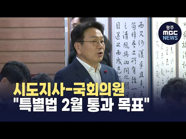 광주시와 전남도, 지역 국회의원들이오늘(21) 국회에서 조찬 간담회를 갖고 행정통합 특별법의 완성도를 높이기 위해핵심 특례 사항을 검토하고입법 전략 등을 논의했습니다. 지난 15일에 이어 일주일 만에 다시 열린 간담회에서 시도지사 등 참석자들은6월 지방선거 일정을 감안해특별법을 2월 국회에서 반드시 처리하자고...