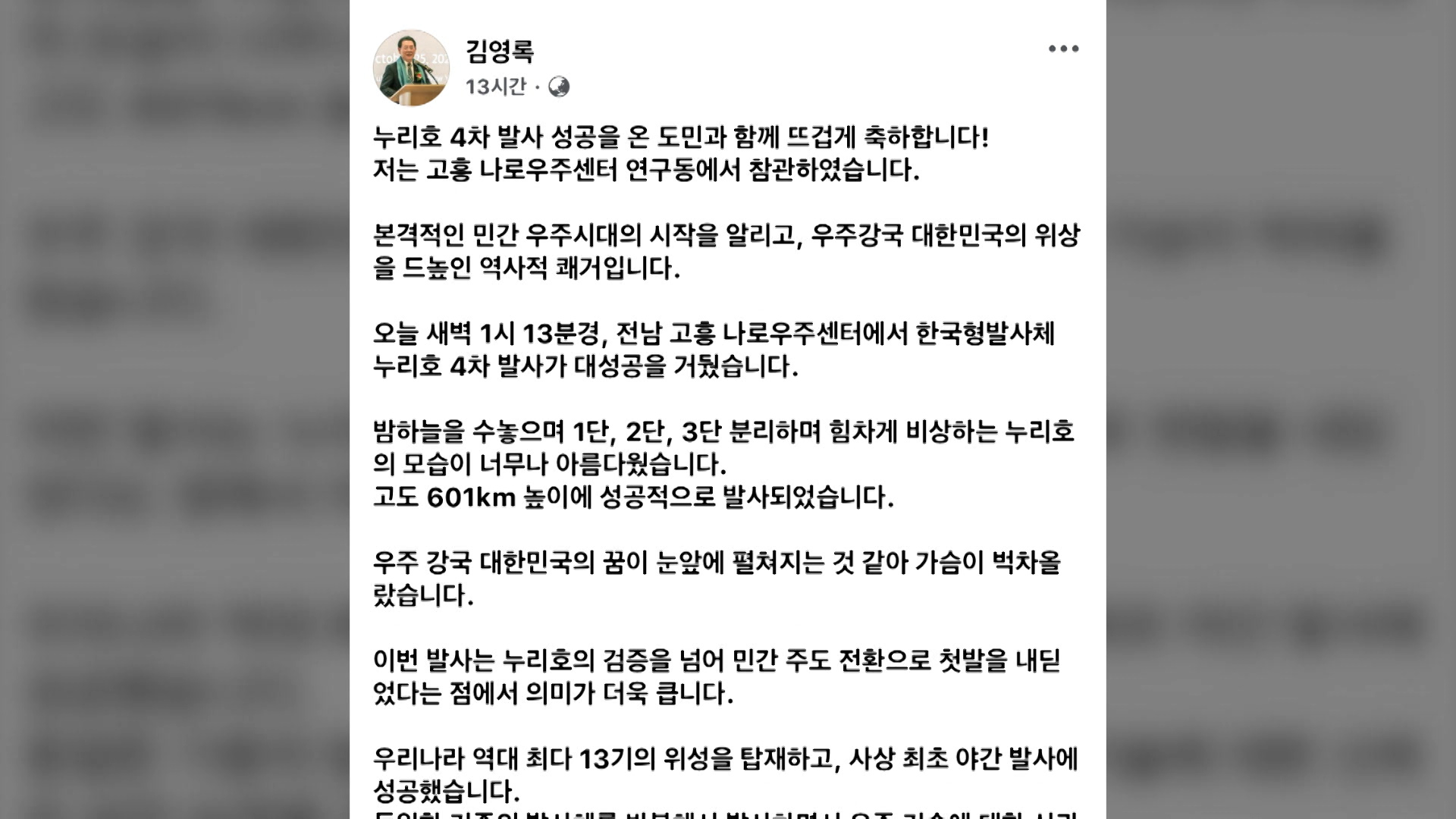 김영록 지사, 누리호 4차 발사 성공 축하