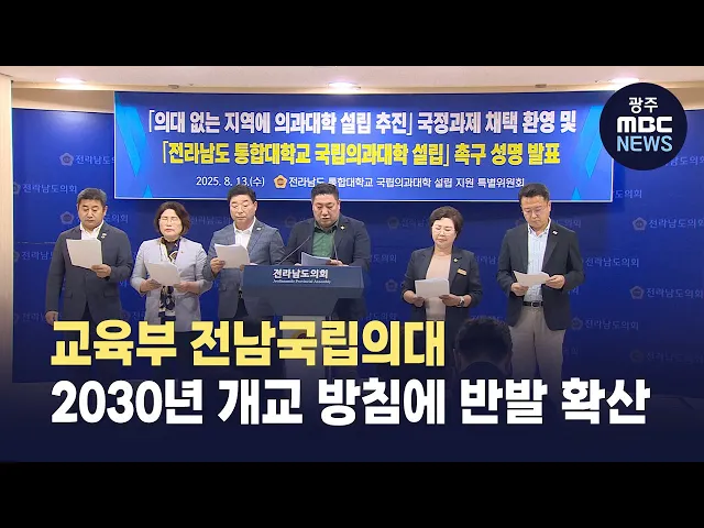 교육부가 제시한 2030년 전남 통합대학교국립의대 개교에 대해 전남지역 반발이 확산되고 있습니다.전남도의회 의대설립 특위는 오늘(5일) 입장문을 내고교육부가 제시한 ‘2030년 전남 국립의대 개교’ 방안에 대해 강한 유감을 표하며 도민의 생명과 건강권 보장을 위해 오는 27년 3월 개교를 조속히 이행할 것을 촉구했습...