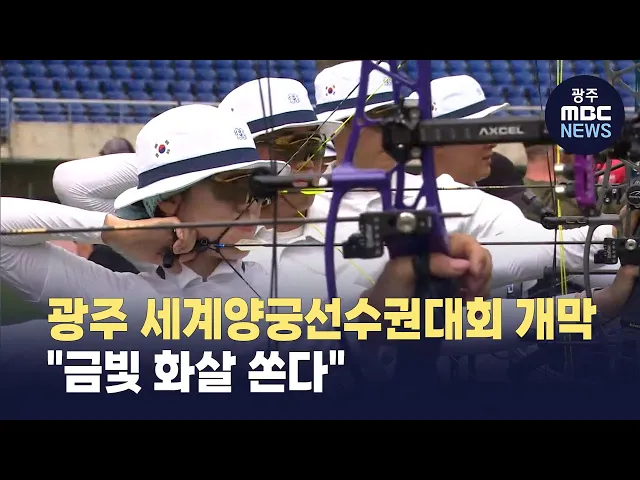 (앵커)광주 세계양궁선수권대회가 오늘(5) 개막해 앞으로 8일간 10개의 금빛 메달을 향한 치열한 경쟁이 시작됩니다.결승전부터는 5.18 민주광장 특설 무대에서 열립니다.천홍희 기자가 보도합니다.(기자)광주 세계양궁선수권대회를 앞두고 선수들 연습이 한창입니다.팽팽하게 활시위를 당기고 과녁을 조준합니다.연습도 실...