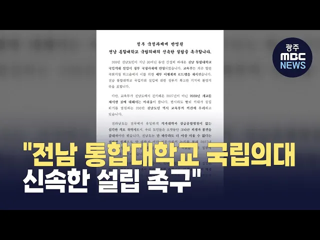 정부가 국정과제로 채택한 전남 통합대학 국립의대 설립시기를 앞당겨야 한다는 주장이 제기됐습니다.김영록 전남지사와 김문수, 김원이 국회의원, 목포대와 순천대는 오늘(4일) 공동성명서를 통해"교육부가 전남도에서 건의해온 2027년이 아닌 2030년 개교를 제시한 것에 대해서 아쉬움이 크다"며 "설립시기를 앞당긴 로드...