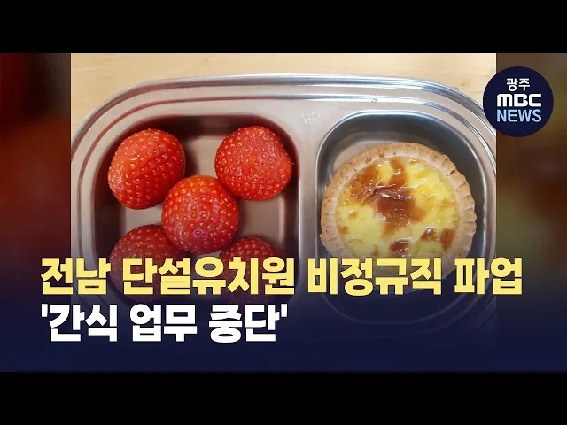 전남지역 학교비정규직 노조 파업으로전남 단설 유치원 28곳의 간식 지급이중단됐습니다.이곳 급식 종사자들은 완제품을 제공하던 기존 간식 업무가 최근 직접 조리해 제공하는 방식으로 바뀌어 업무가 과중된다며, 학교급식법 시행령 상 "점심시간 이외의 간식은 급식 업무에 해당하지 않는다"고 주장하고 있습니다.이에 ...
