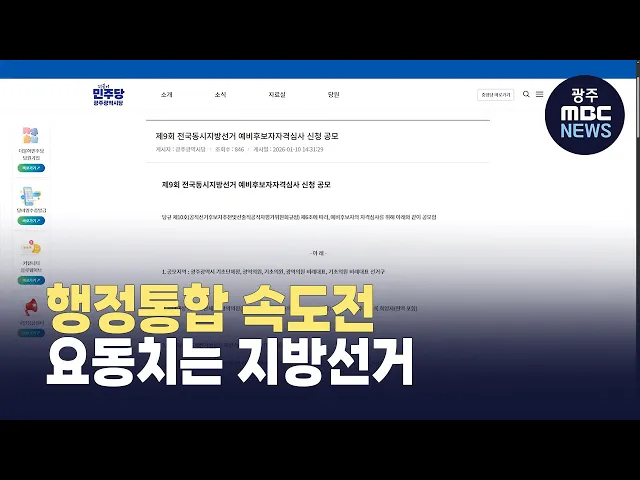 (앵커)지방선거가 5개월도 남지 않은 가운데행정통합 이슈로선거판이 요동치고 있습니다.행정통합이라는 거대담론이시민들의 삶과 직결되는 지방선거를삼켜버리고 있습니다.정용욱 기자입니다.(기자)오는 6월 지방선거를 앞두고 더불어민주당 광주시당이 내일(13)부터 20일까지 기초단체장이나 지역의원 출마를 원하는 예비...