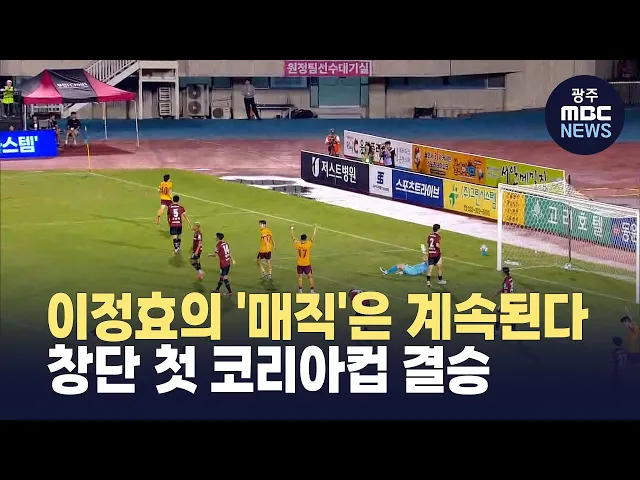 (앵커)K리그의 흥행카드죠.이정효 감독이 이끄는 광주FC가 구단 창단 이후 처음으로 코리아컵 결승에 진출했습니다.오는 12월 열리는 코리아컵을 우승하게 되면 내년에 열리는 아시아챔피언스리그 엘리트(ACLE) 진출도 가능합니다.보도에 김영창 기자입니다.(기자)0대 1로 끌려가던 경기 후반, 헤딩골로 동점을 만들더니 종...