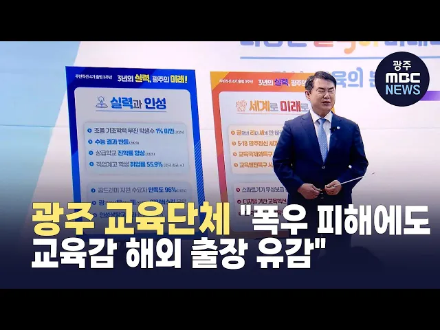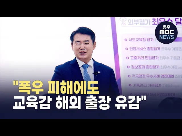 광주의 한 교육 단체가 폭우 피해에도 이정선 광주시교육감이 해외 출장을 갔다며 비판했습니다.학벌없는 사회를 위한 시민모임은 오늘(25일) 보도자료를 내고, "이정선 교육감이 재난 시기에 국외 출장을 강행한 것은 유감"이라며, "재난 지역 선포를 고민할 만큼 광주에 기록적 폭우가 쏟아진 직후"였다고 밝혔습...