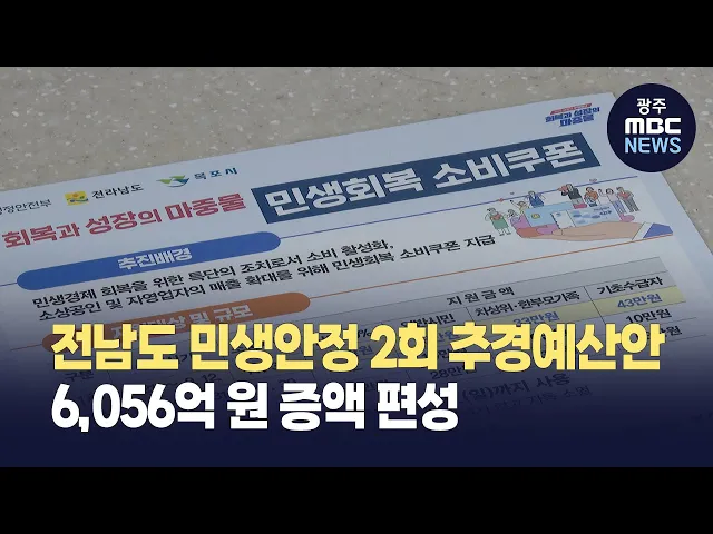 전라남도는 새 정부의 경기진작과 민생안정 기조에 맞춰 2025년 제2회 추경예산안을 6천56억 원을 증액편성해 의회에 제출했습니다.주요 증액 내용은민생회복 소비쿠폰 5천 백21억 원을 반영하고지역사랑상품권 발행지원 785억 원,고용둔화 지원사업 78억 원,마른김 가공시설 수급구조 개선산업 2백억 원 등입니다.전남도의...