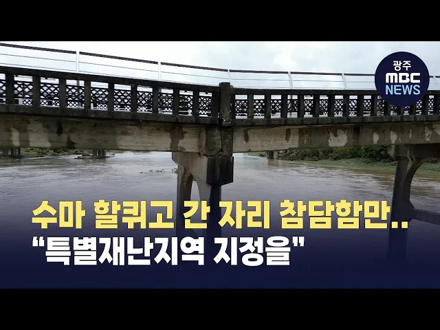 (앵커)이번 극한 호우는 광주와 전남에 큰 생채기를 남겼습니다.실종자 2명은 오늘도 발견하지 못했고, 수마가 휩쓸고 간 삶 터전에선 멀쩡한 걸 찾을 수가 없습니다.특별재난지역 지정 등 정부 지원이 절실한 상황입니다.주현정기자 입니다.(기자)거칠게 흐르는 흙탕물 한가운데 선 남성이누군가를 필사적으로 붙잡고 있습...