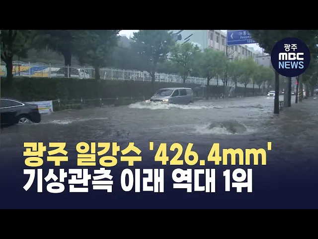 어제(17) 내린 비가 광주지역 역대 최대 일강수량을 기록했습니다.광주지방기상청에 따르면어제 오전 10시부터 하룻사이에광주에 426.4mm의 비가 내렸습니다.이는 1939년 기상 관측을 시작한 이후역대 최고 일강수량으로 1989년 7월 25일에 기록된335.6mm에 비해서도 90mmm가 넘는 강수량입니다.시간당 최대 강수도 76.2mm...