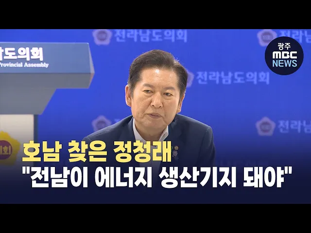 정청래 더불어민주당 당대표 후보가호남을 찾아 전남이 에너지 생산기지가 돼야 하고, 당대표가 되면 대통령에게 기후에너지부의 호남 유치에 대해건의하겠다고 밝혔습니다.정청래 후보는 오늘(17) 전남도의회를 찾아"전남에는 햇빛과 바람이 풍부하다"면서"RE100 시대에 맞는 에너지 생산기지는전남에 두는 것이 맞고, 산...