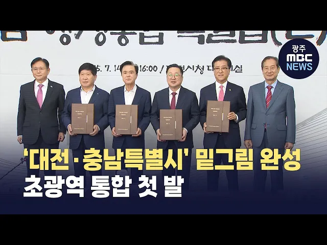 (앵커)수도권 집중과 지역 소멸 위기를 넘어서기 위한 대전과 충남의 초광역 통합 논의가 본격화됐습니다.‘대전·충남특별시’ 설치를 위한 특별법 최종안이 확정돼 시도지사와 시도의회 의장에게 공식 제안됐습니다.대전문화방송 이교선 기자입니다.(기자) 대전시청에서 열린 대전·충남 행정통합 민관협의체 5차 회의.‘대전...
