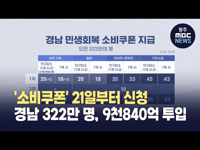 (앵커)이재명 정부의 '민생회복 소비쿠폰' 1차 지급*신청이 오는 21일 시작됩니다.가장 궁금한 건 '나는 얼마를 받느냐'일 텐데요1인당 최소 18만 원에서 최대 55만 원까지 지원하는 경남의 사례를 참고하면 도움이 될 겁니다.MBC경남 박종웅 기자입니다. (기자)지난 4일, 국회에서 13조9천억 규모의 '민생회복 소비쿠폰' ...