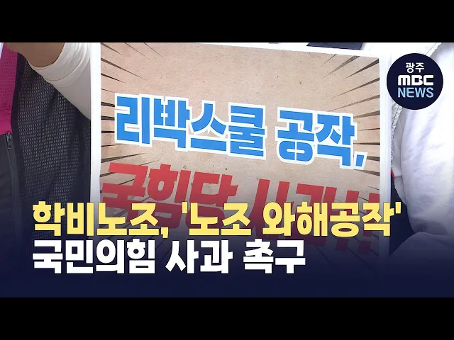 학교비정규직노동조합 광주지부가 '노조 와해 공작'을 벌였다고 주장하며국민의힘의 즉각적인 사과와 '리박 스쿨'에 대한 특검 실시를 촉구했습니다.이들은국민의힘 광주시당 앞에서 기자회견을 열고'리박스쿨'과 국민의힘 조정훈 의원이학비노조를 무력화할 목적으로직영 무상급식 제도를 없애고학교 급식실의 필수 공익사...